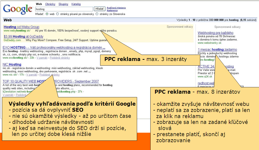 Reklama v Google sa zobrazuje vo viazanosti na nastavené kľúčové slová. Jedná sa o PPC reklamu Pay-Per-Click - platba za klik – znamená to, že platíte len za návštevníkov, ktorí kliknú na vašu reklamu. Reklama sa nastavuje cez systém Google AdWords cez Google účet.